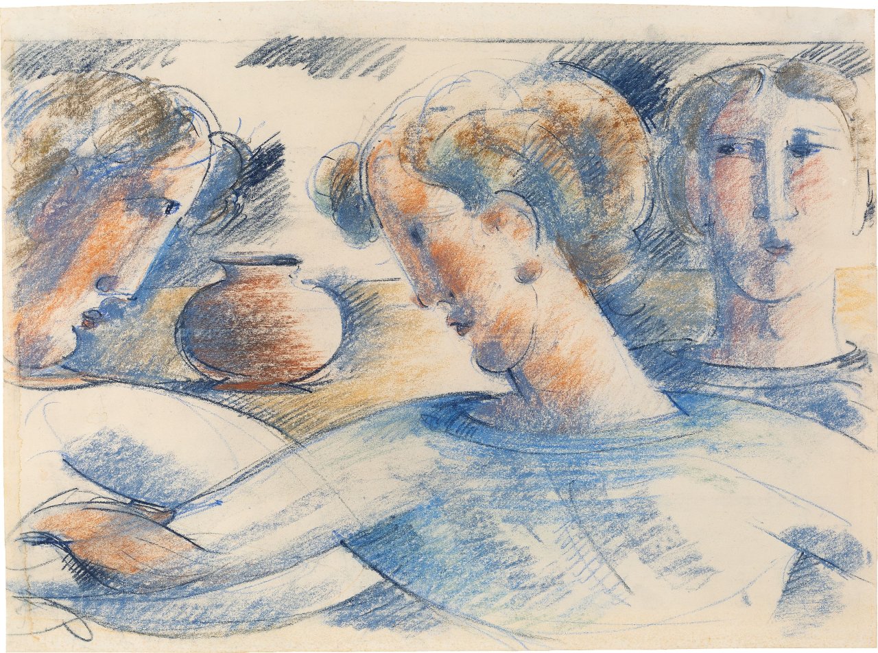 „Freundesgruppe mit Tisch und Vase“. 1935. Pastell auf festem Papier (Rückseite des Vordrucks für den Bauhaus-Unterricht „Der Mensch“) 48,2 × 65,2 cm.