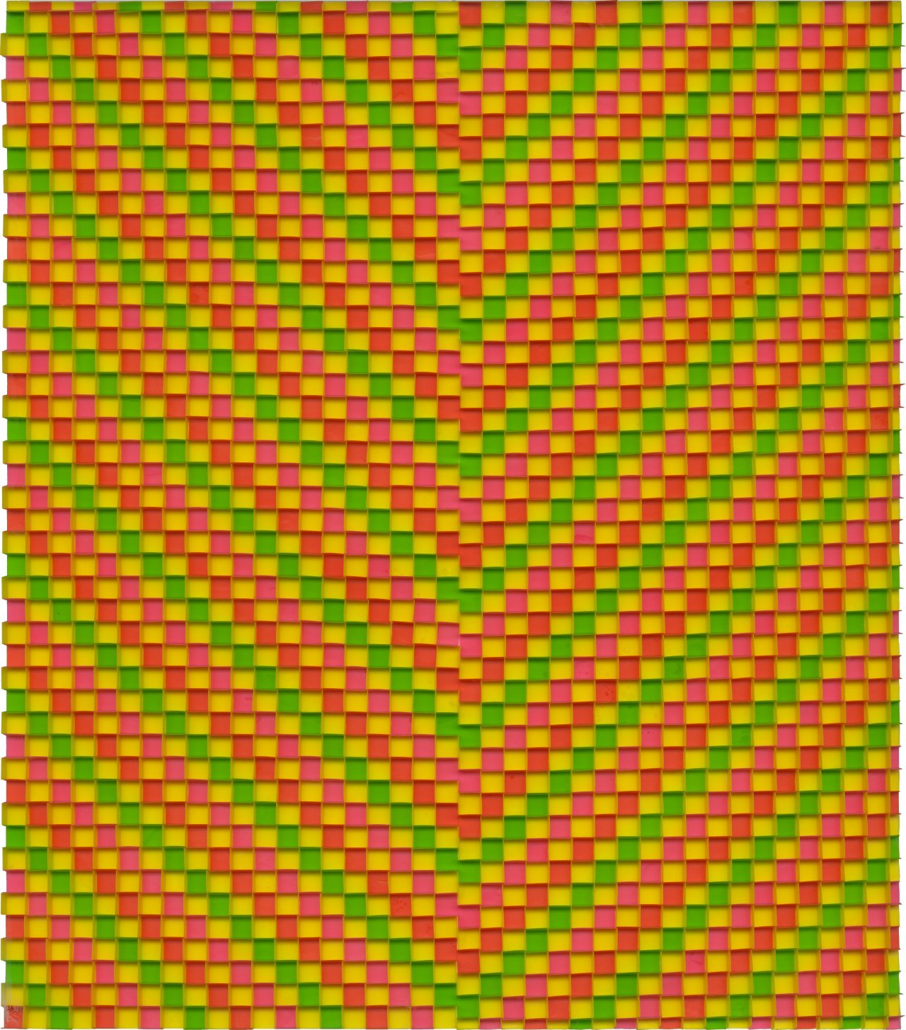 „Stroke Line“. 2008. Farbige Acrylplättchen auf PVC, auf Leinwand aufgezogen, im Acryl-Objektrahmen 114 × 100 × 4,5 cm.