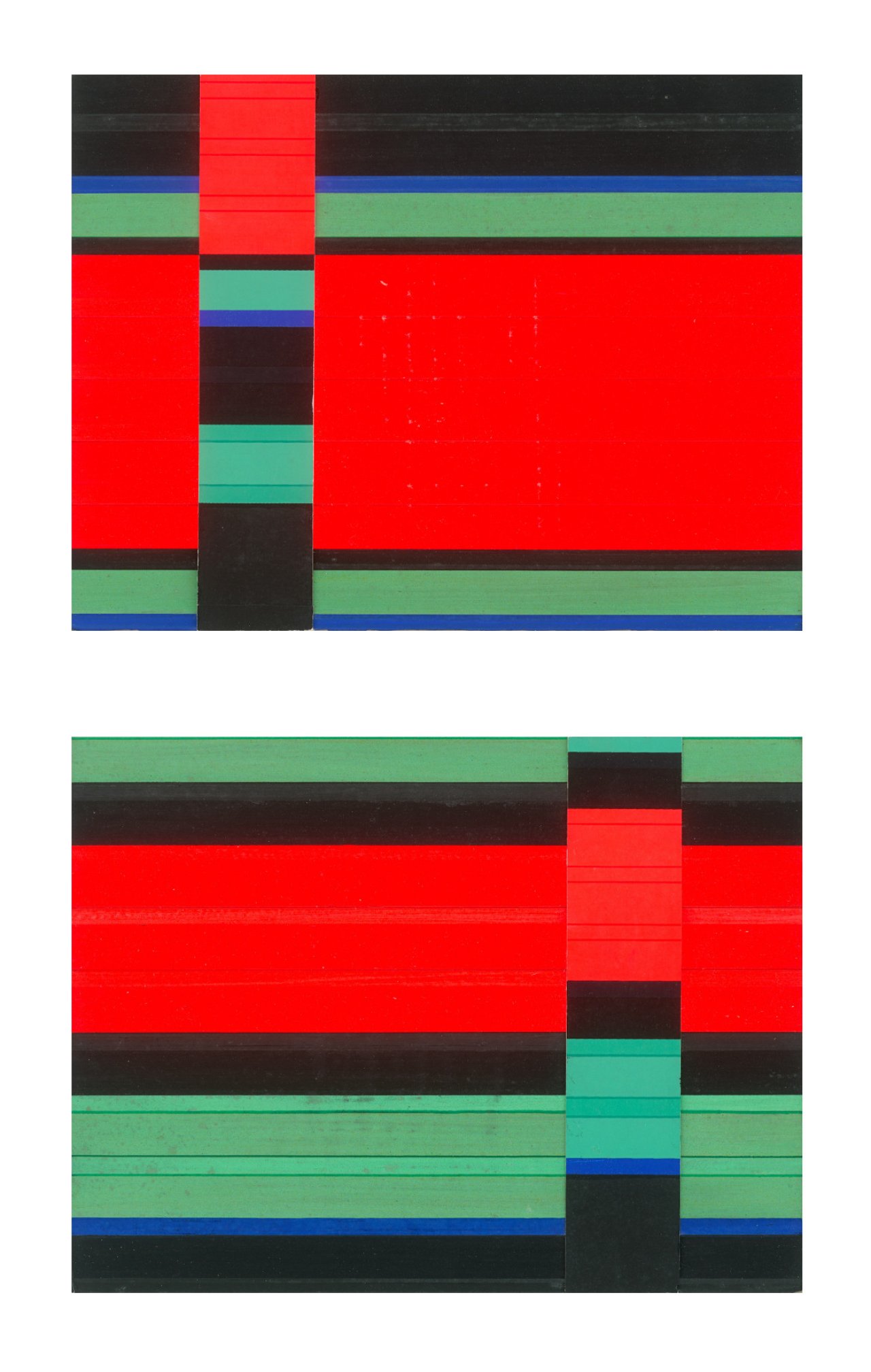 Ohne Titel (Entwurf für ein Wandbild I & II). Um 1970. 2-teilig: Acryl und Papiercollage auf Pappe, auf Spanplatte aufgezogen. Jeweils: 18,5 × 24,1 × 2 cm. EUR 6.000–8.000