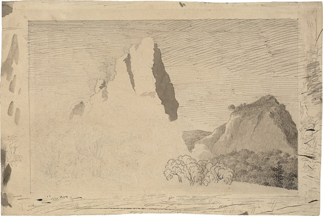 „Landschaft mit Felsgipfel“. Um 1799. Feder in Schwarz, laviert, und Bleistift auf chamoisfarbenem Velin (Wasserzeichen: W Elgar 1796). 18,3 × 26,9 cm. EUR 80.000–120.000