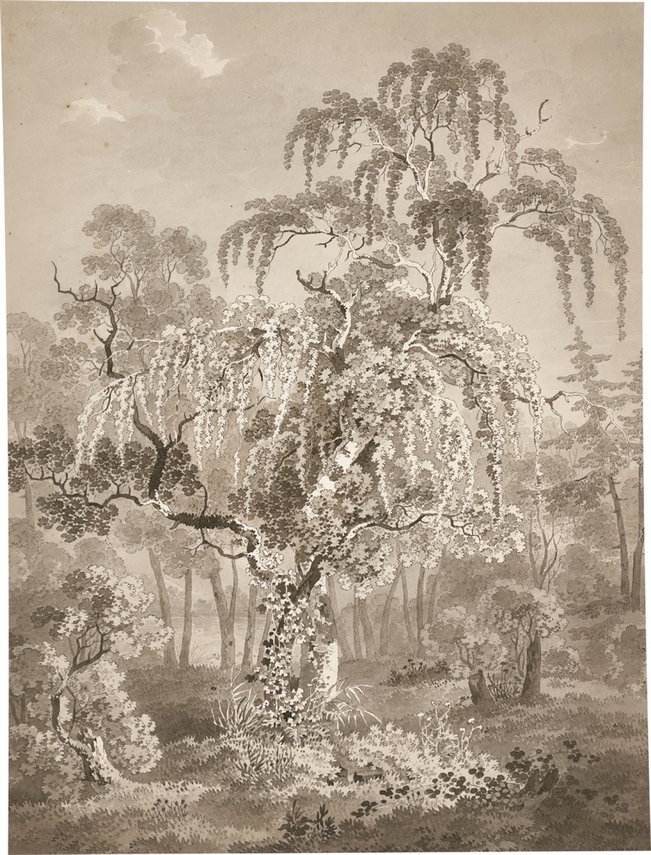 Waldpartie mit kleinem Weiher. Feder in Schwarz, laviert, auf Papier. 42,3 × 32,1 cm. EUR 2.500–3.500